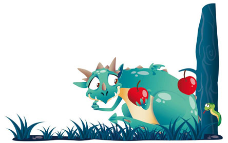 De repente, una manzana cayó del árbol y le pegó a Dragón en la cabeza.Justo en ese momento, una culebra chiquita y traviesa se deslizó cerca deDragón y quiso hacerle una broma, se escondió detrás de una roca y dijo: